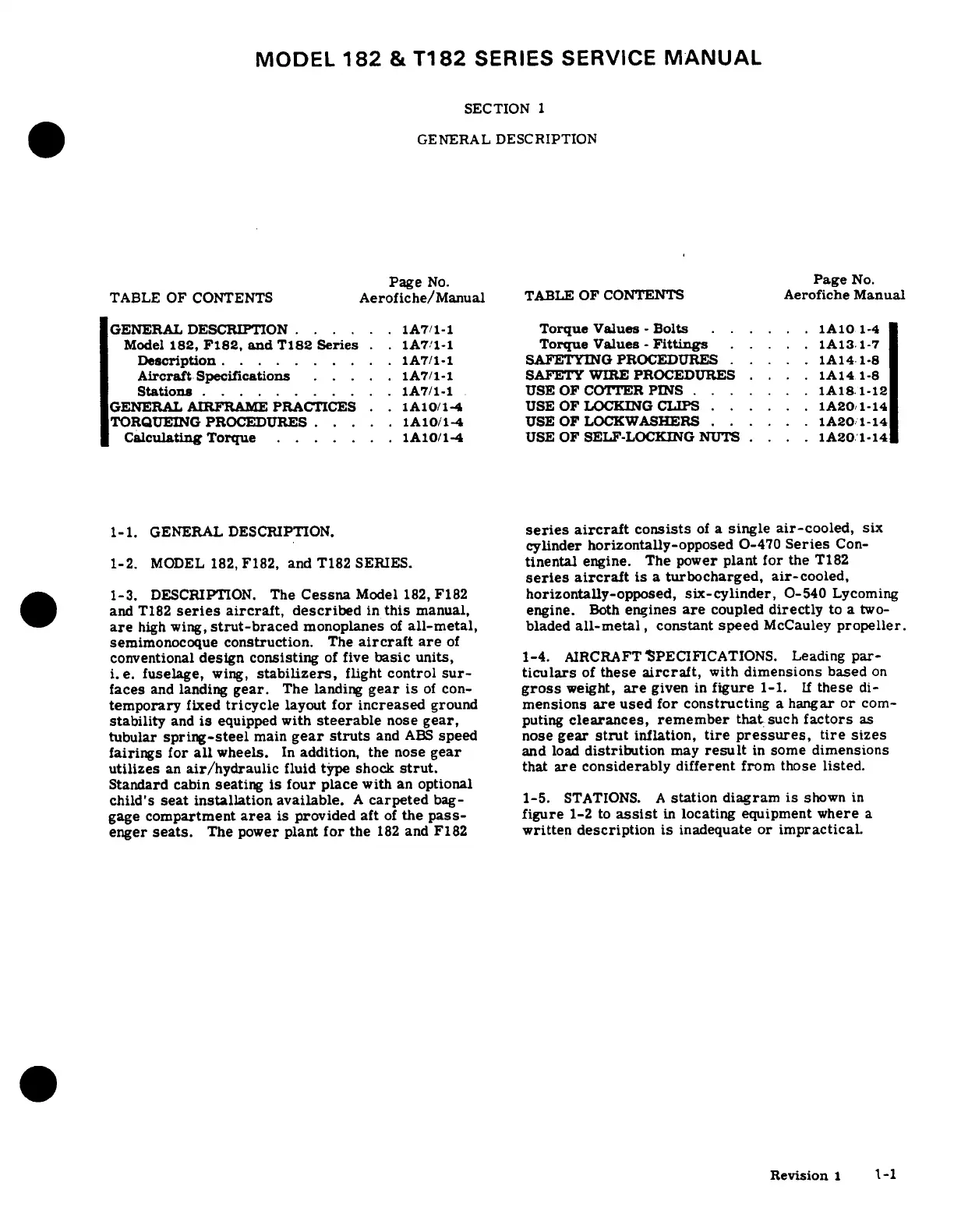 Cessna 182 1978 - General Description; Stations; Model 182, F182 and T182 Series; Aircraft Specifications
