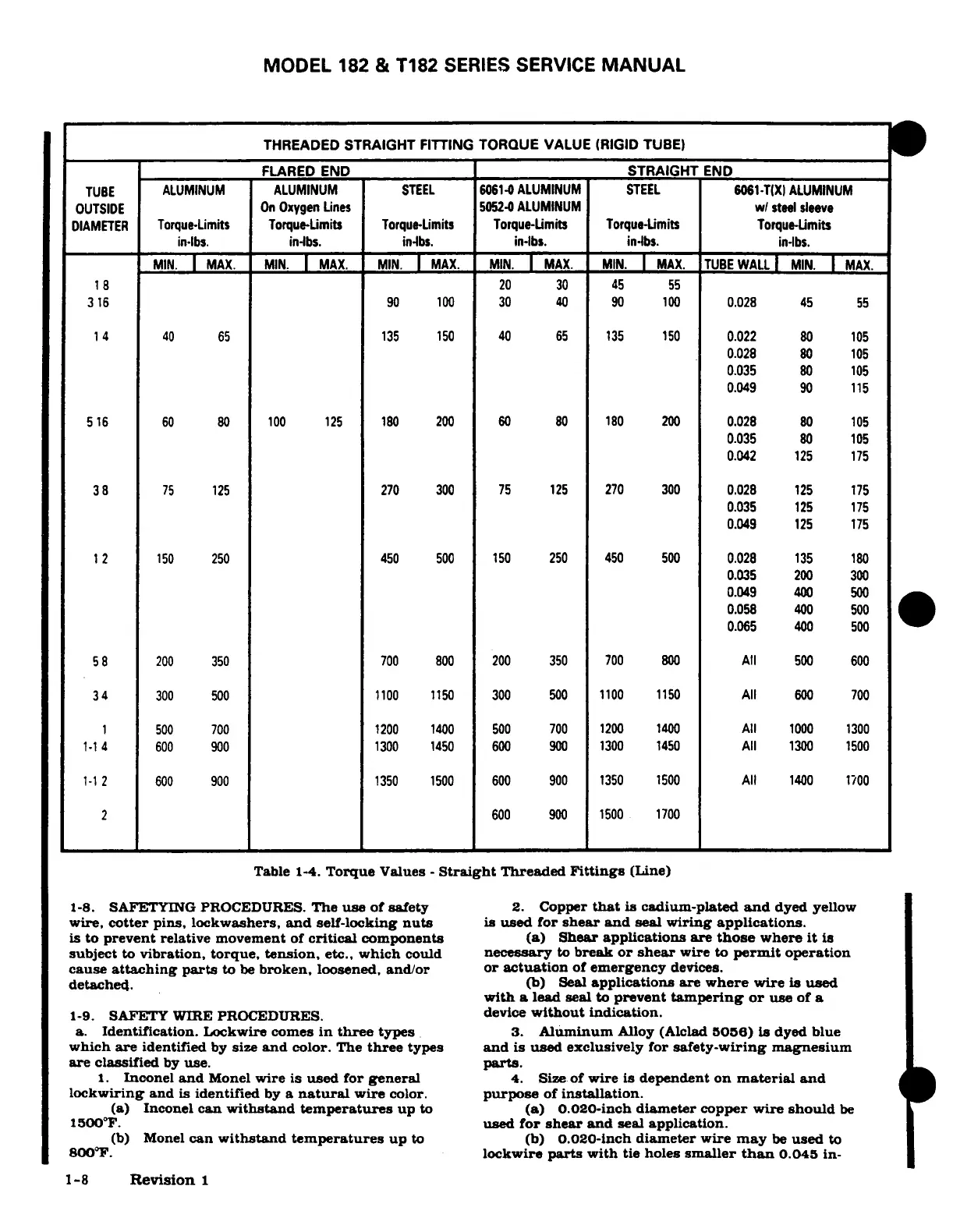 Cessna 182 1978 - Safetying Procedures; Safety Wire Procedures; Torque Values - Straight Threaded Fittings