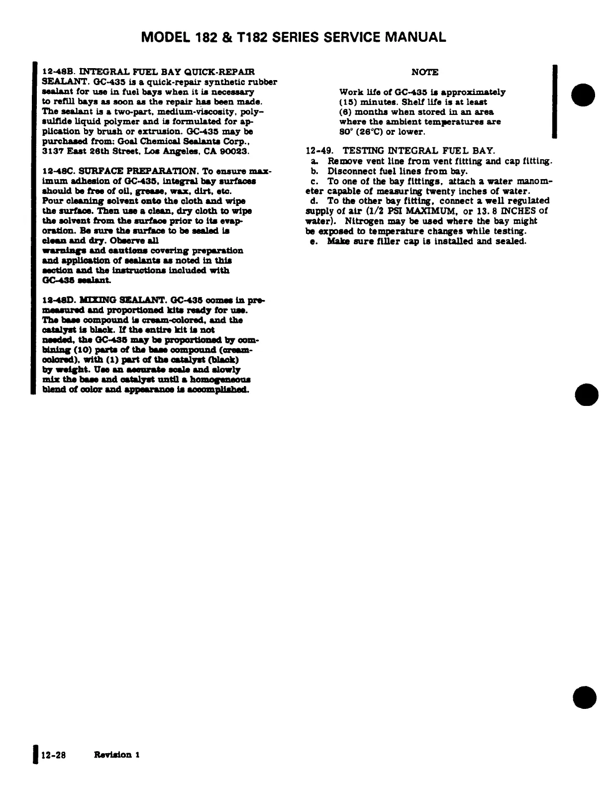 Cessna 182 1978 - Integral Fuel Bay Quick-Repair Sealant; Surface Preparation; Testing Integral Fuel Bay