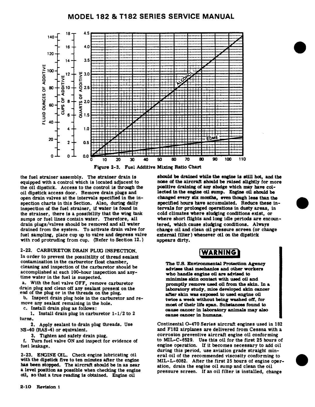 Cessna 182 1978 - Fuel Additive Mixing Ratio Chart; Engine Oil; Carburetor Drain Plug Inspection