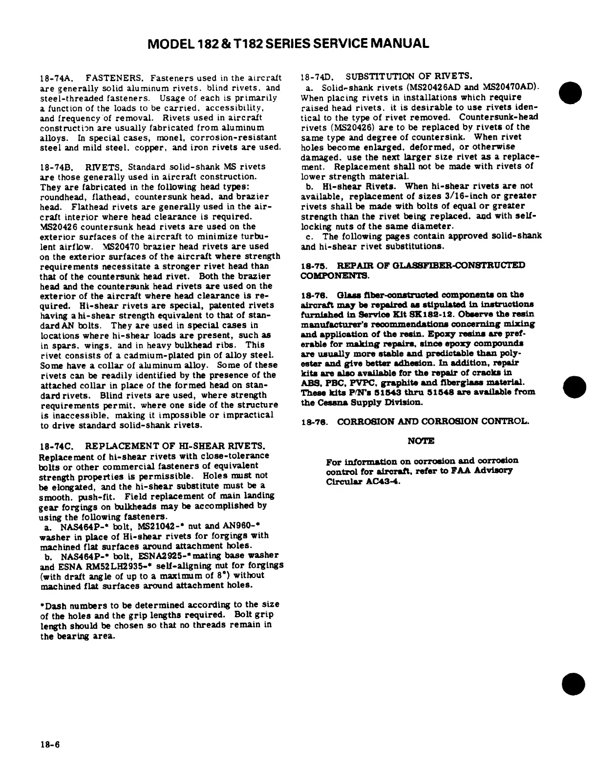 Cessna 182 1978 - Rivets; Replacement of Hi-Shear Rivets; Substitution of Rivets; Repair of Glassfiber-Constructed Components