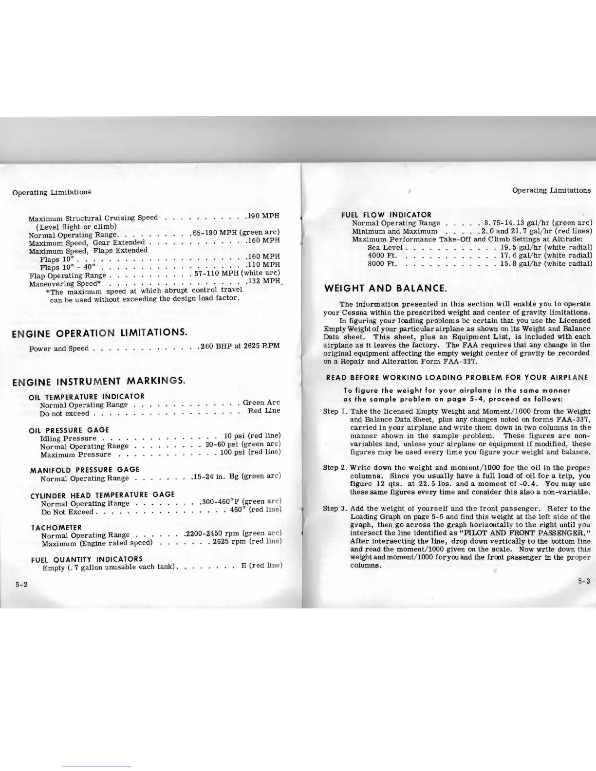 Cessna 210B - Read before Working Loading Problem; Section V - Operating Limitations; Engine Instrument Markings; Engine Operation Limitations