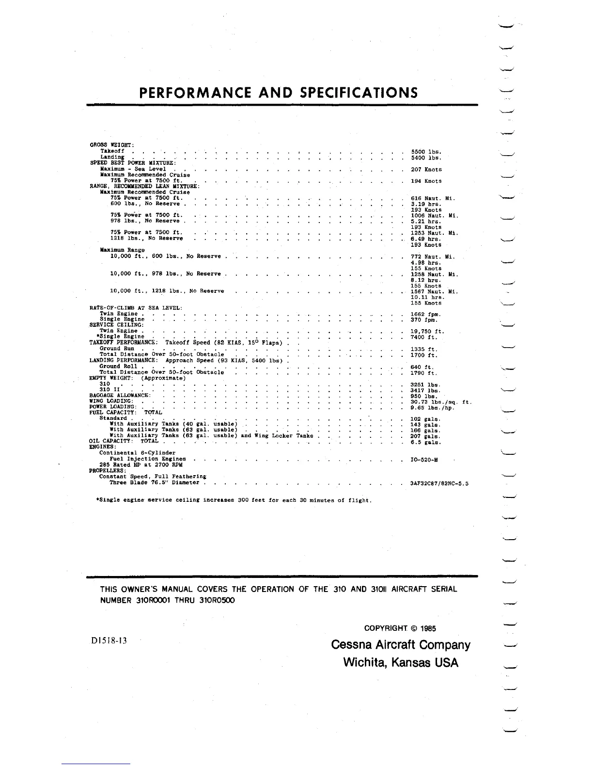 Cessna 310 1975 - Performance and Specifications
