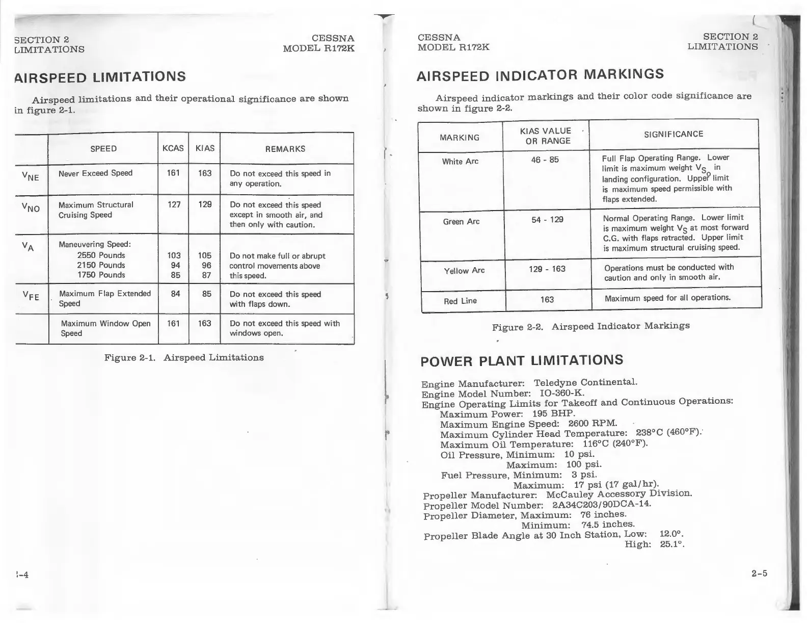 Cessna Hawk XP - Section 2 Limitations; Airspeed Limitations; Power Plant Limitations
