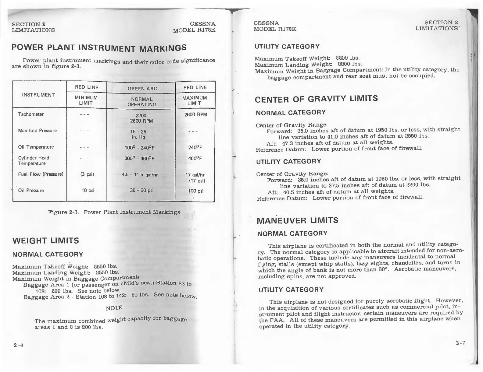 Cessna Hawk XP - Power Plant Instrument Markings; Center of Gravity Limits; Weight Limits