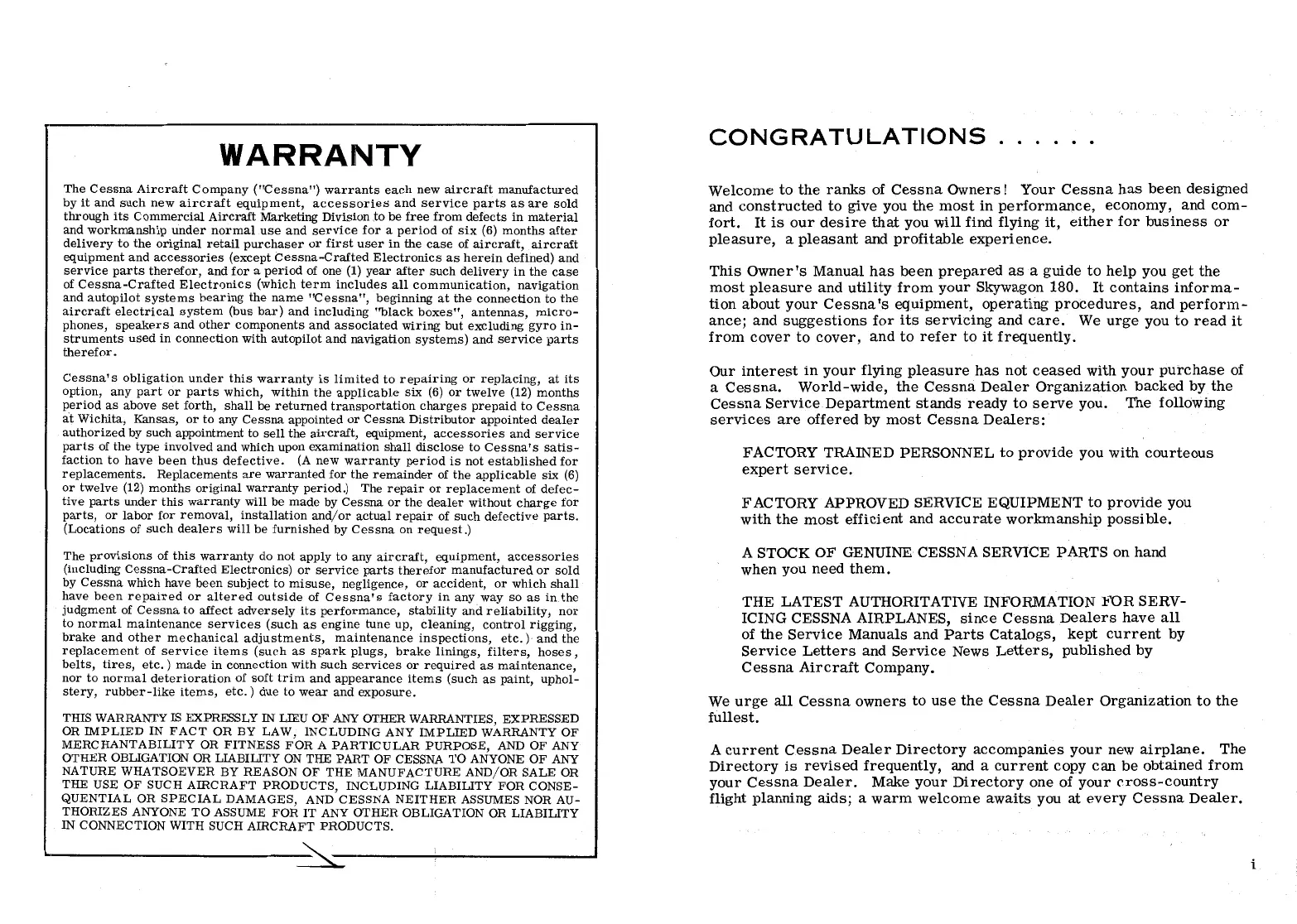 Company ("Cessna") warrants each new aircraft