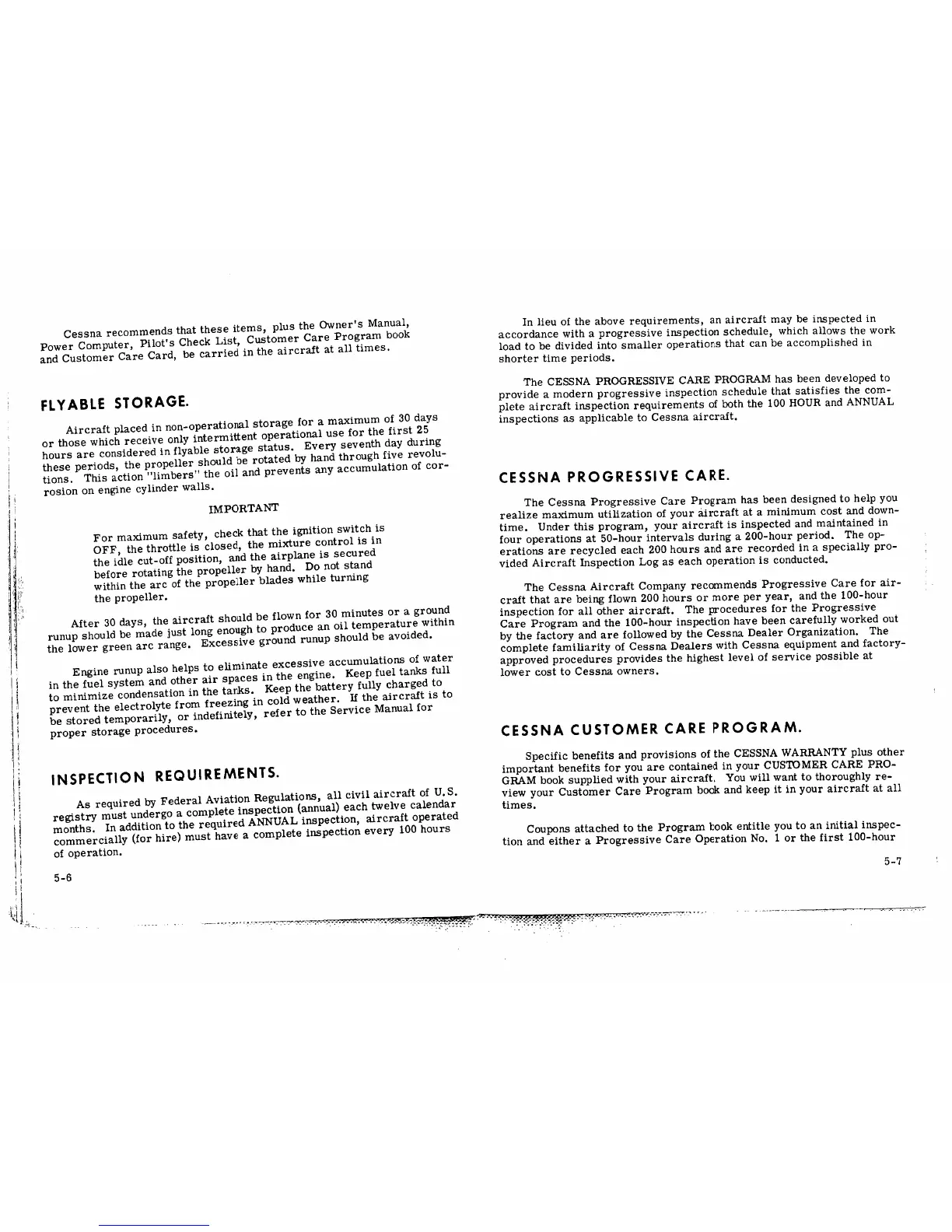 Cessna Skywagon 185 - Flyable Storage; Cessna Progressive Care; Inspection Requirements