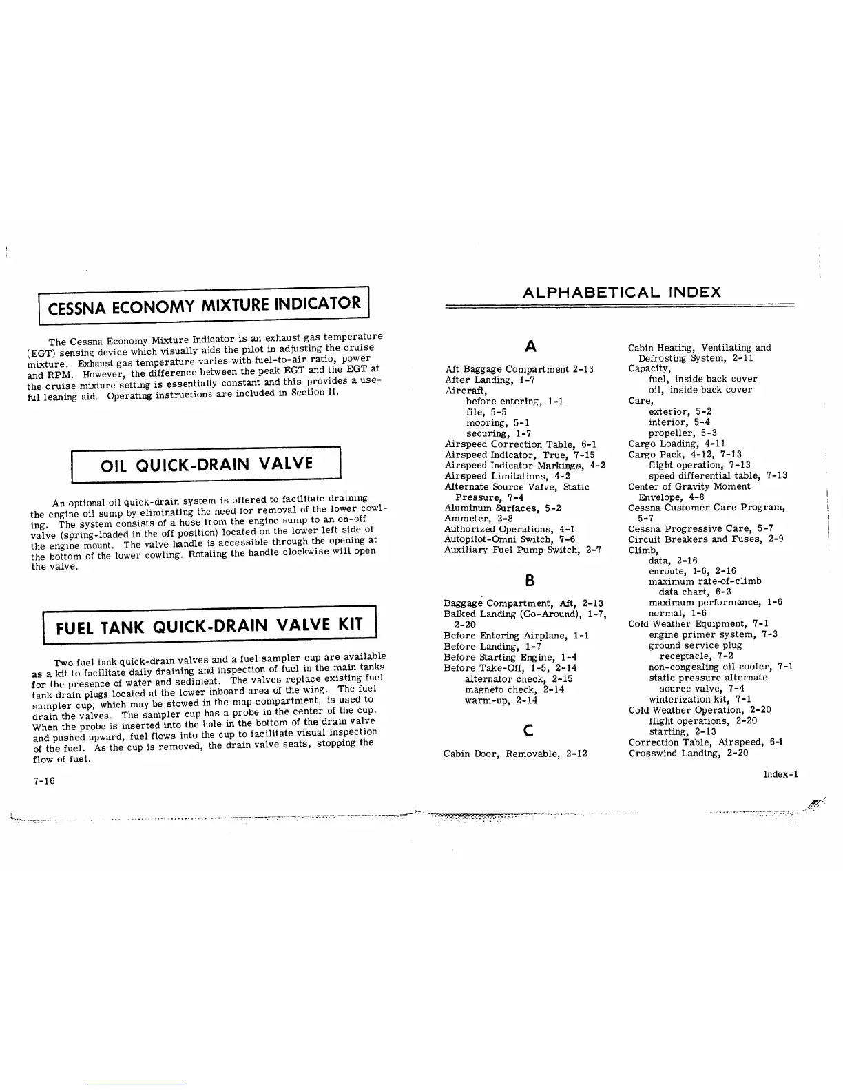 Cessna Skywagon 185 - Cessna Economy Mixture Indicator; Oil Quick-Drain Valve; Fuel Tank Quick-Drain Valve Kit; Index