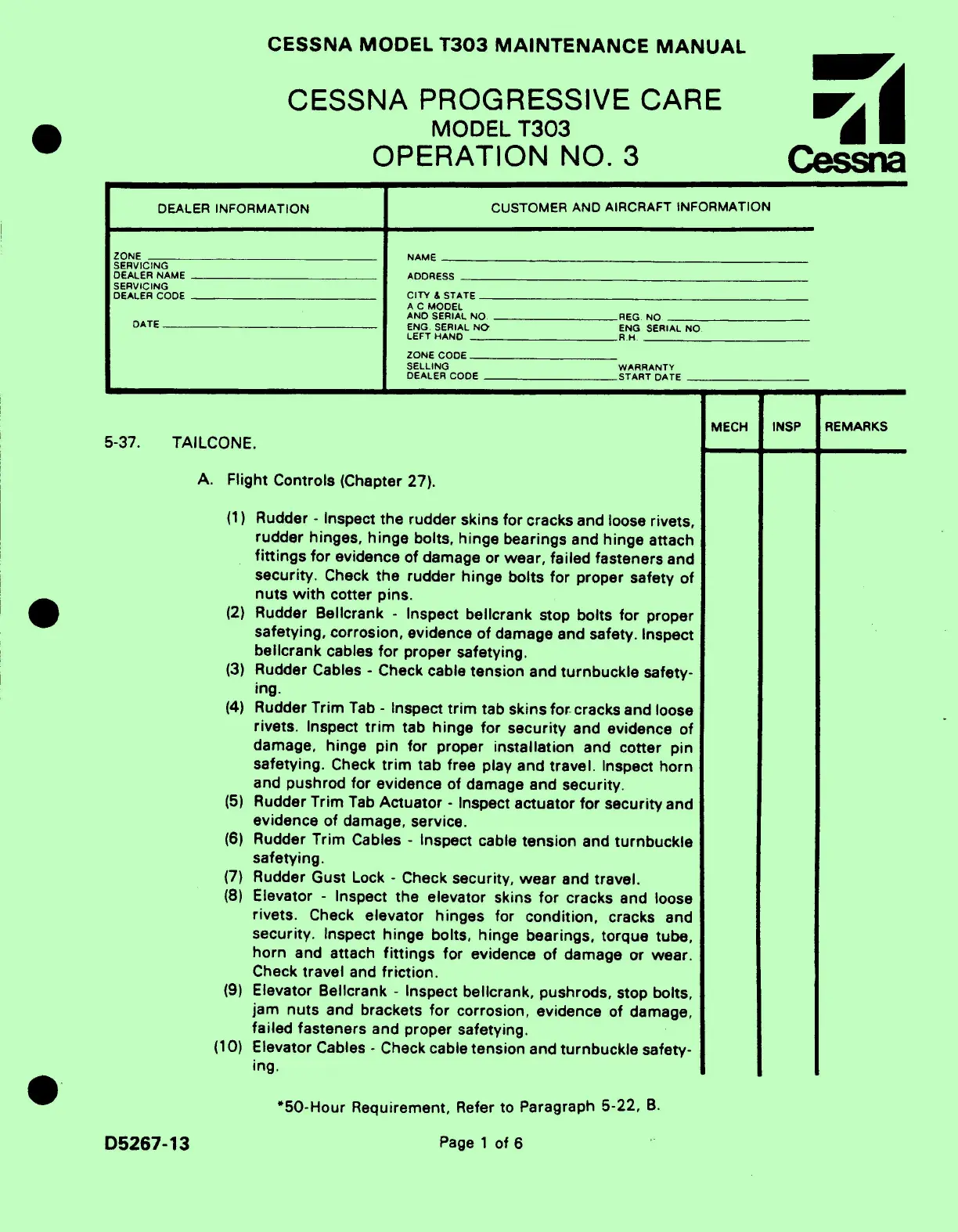 Cessna T303 - 5-35. SPECIAL INSPECTION ITEMS.; 5-36. POST INSPECTION.; A. Lubrication and Servicing; B. Correct all discrepancies
