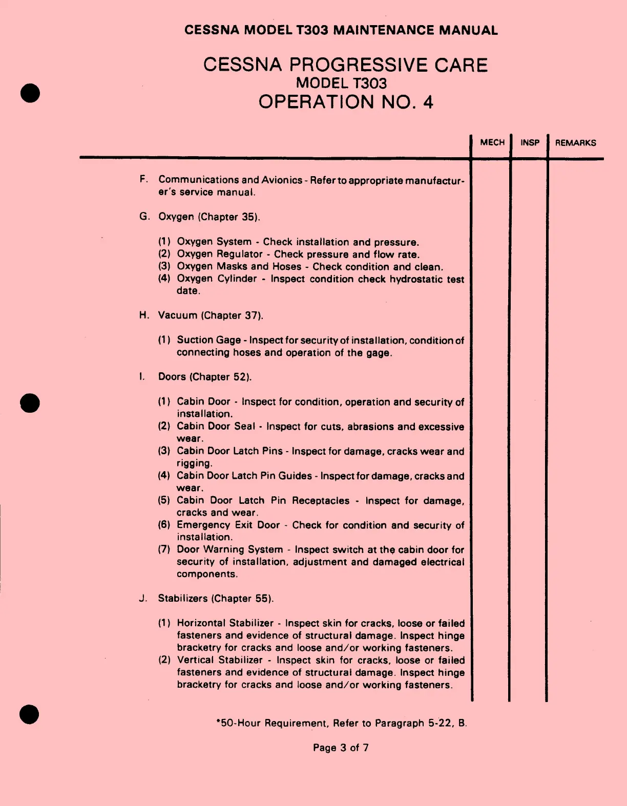 Cessna T303 - F. Communications and Avionics; G. Oxygen (Chapter 35).; H. Vacuum (Chapter 37).; I. Doors (Chapter 52).