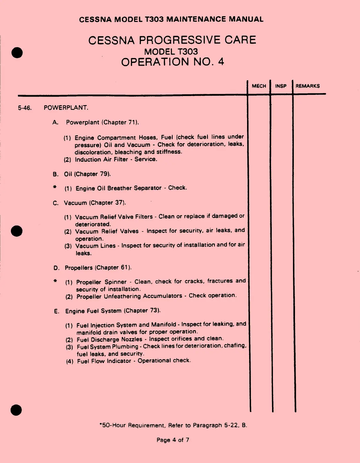 Cessna T303 - 5-46. POWERPLANT.; A. Powerplant (Chapter 71).; B. Oil (Chapter 79).; C. Vacuum (Chapter 37).