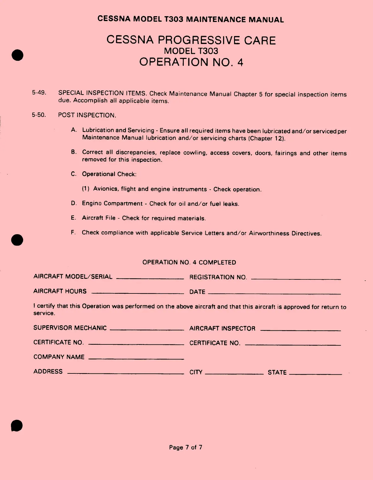 Cessna T303 - 5-49. SPECIAL INSPECTION ITEMS.; 5-50. POST INSPECTION.; A. Lubrication and Servicing; B. Correct all discrepancies