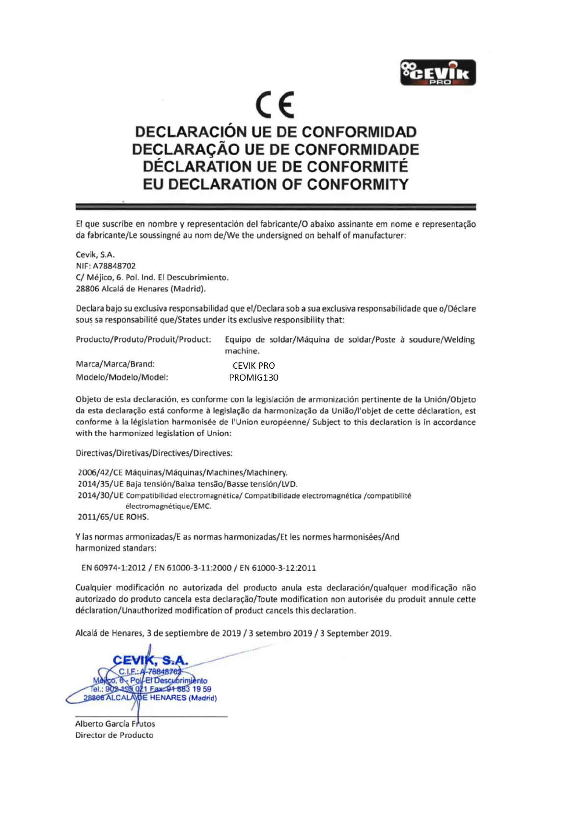 CEVIK PRO PROMIG 130 - Déclaration de Conformité UE; Declaração UE de Conformidade; EU Declaration of Conformity