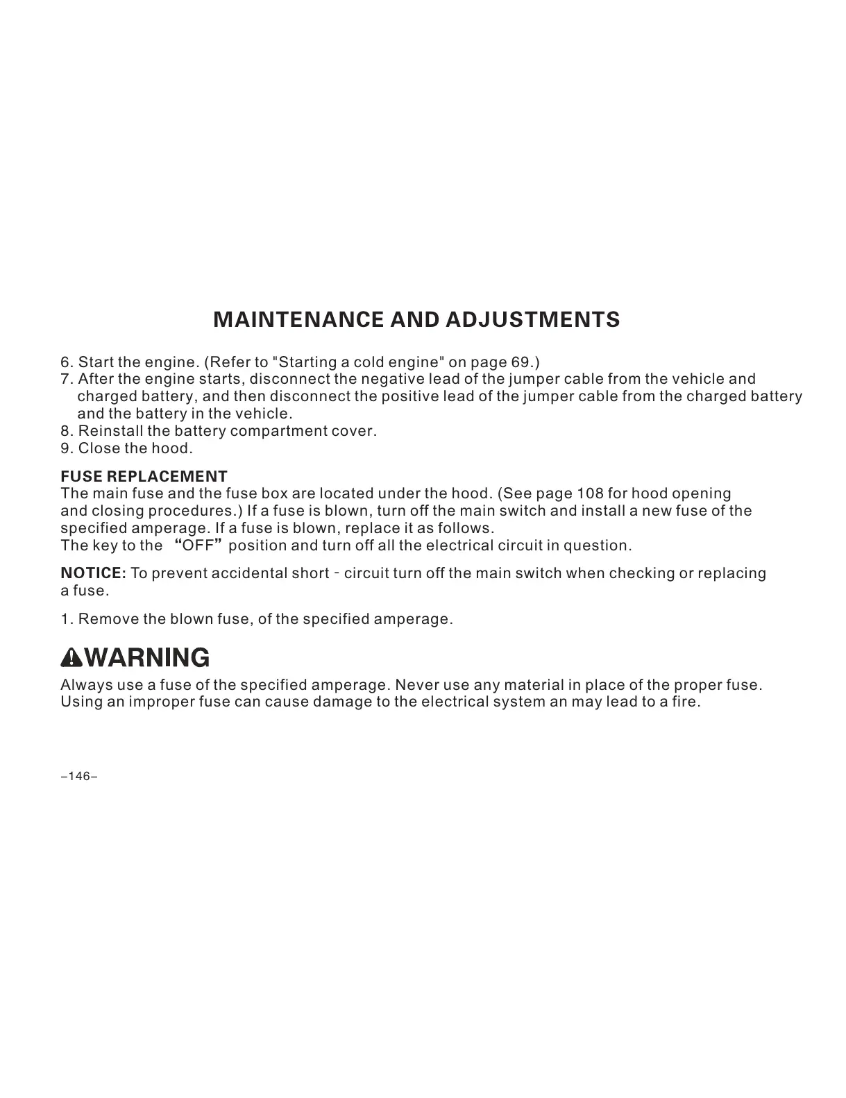The main fuse and the fuse box are located under the hood. (See page 108 for hood opening