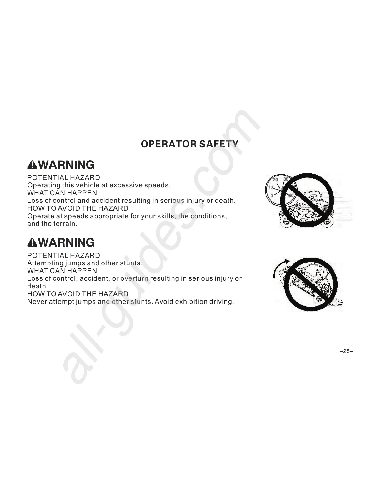 Never attempt jumps and other stunts. Avoid exhibition driving.