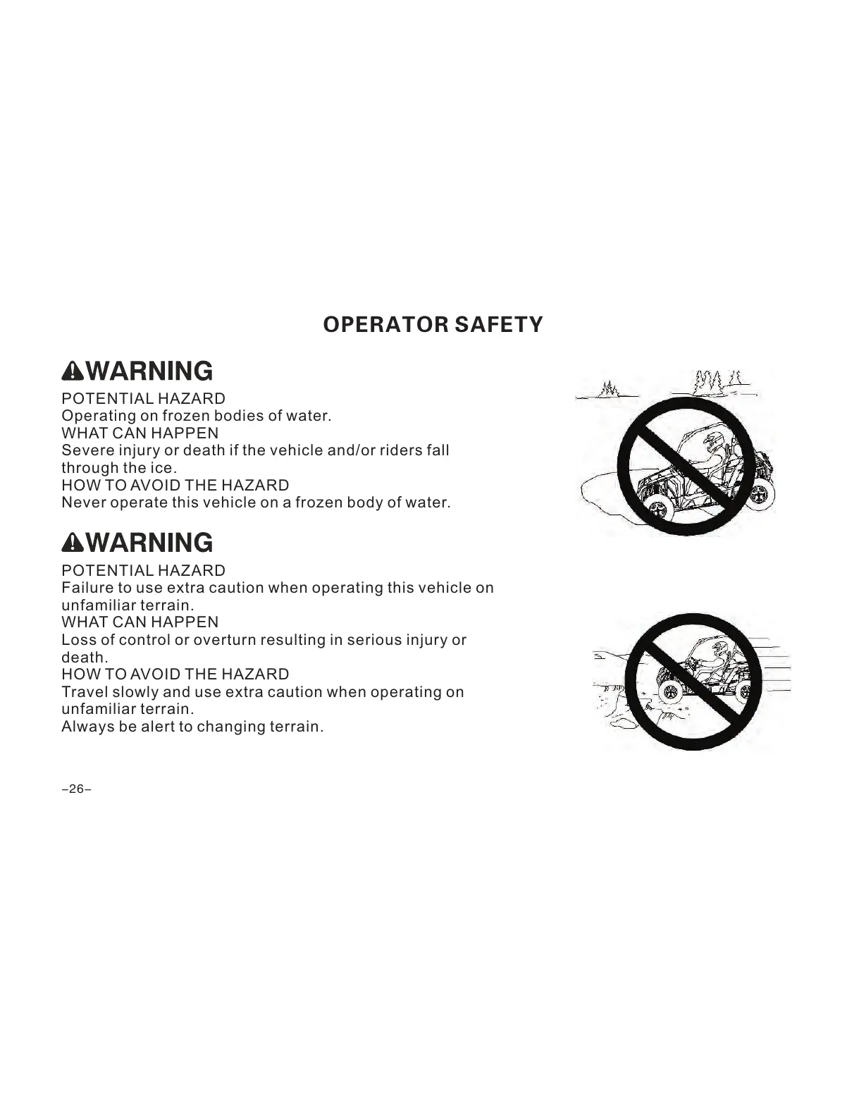 Never operate this vehicle on a frozen body of water.