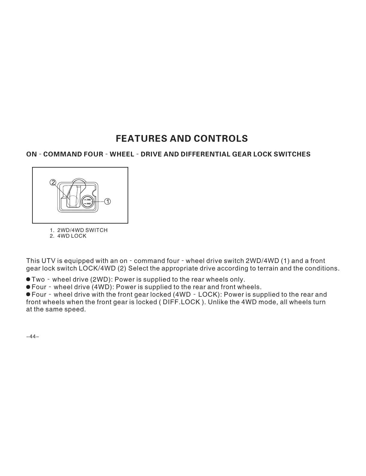 This UTV is equipped with an on‐command four‐wheel drive switch 2WD/4WD (1) and a front