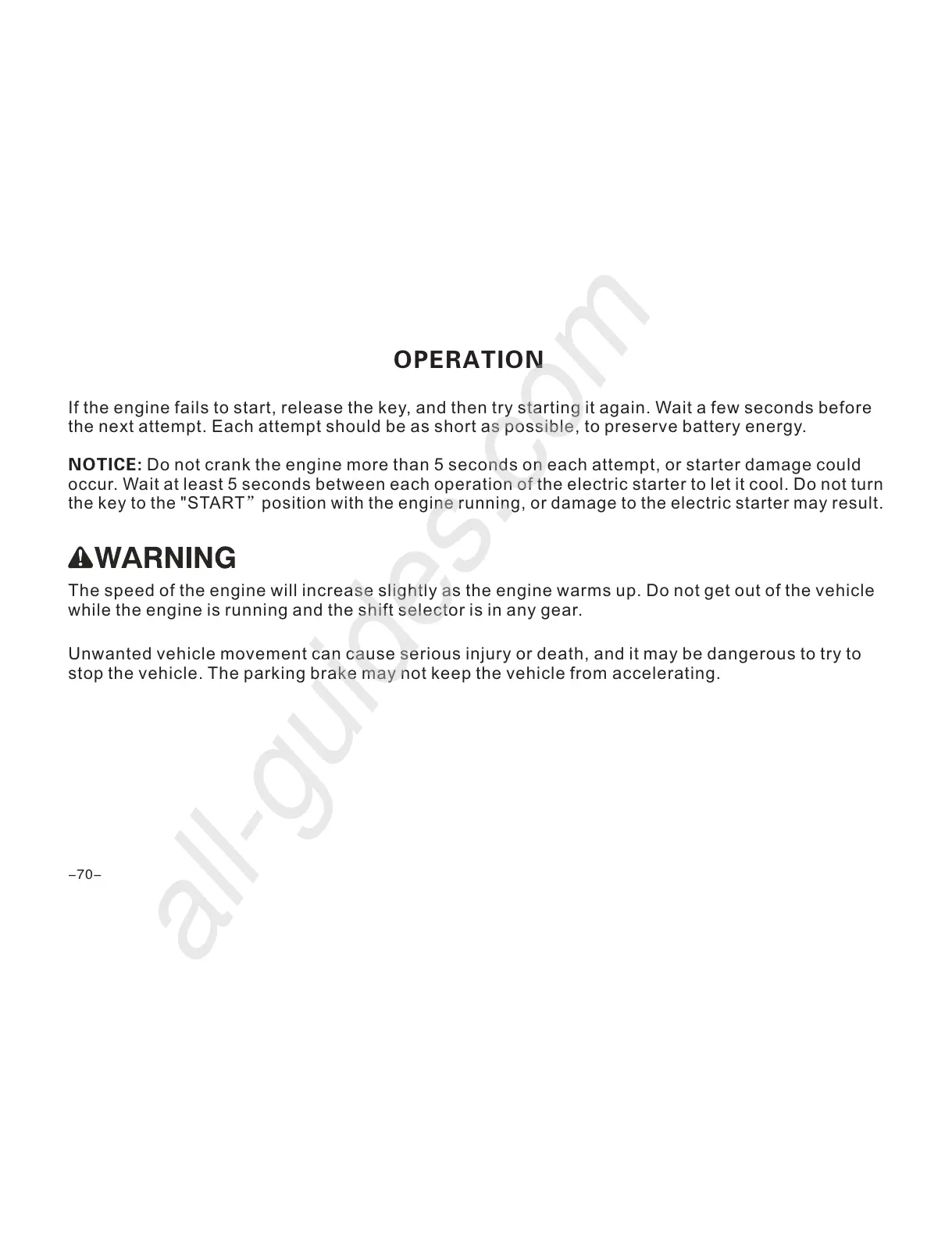 NOTICE: Do not crank the engine more than 5 seconds on each attempt, or starter damage could