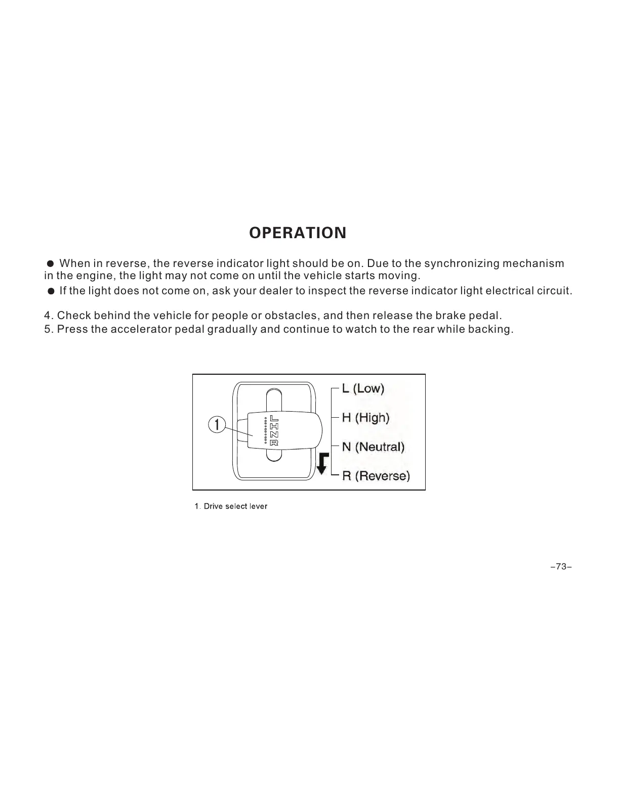If the light does not come on, ask your dealer to inspect the reverse indicator light electrical circuit.
