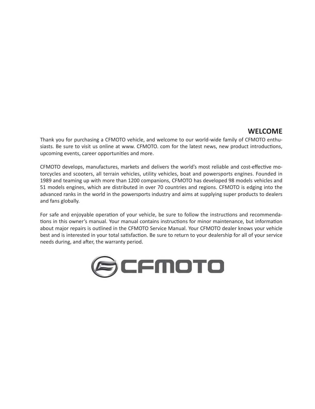 Thank you for purchasing a CFMOTO vehicle, and welcome to our world-wide family of CFMOTO enthu-