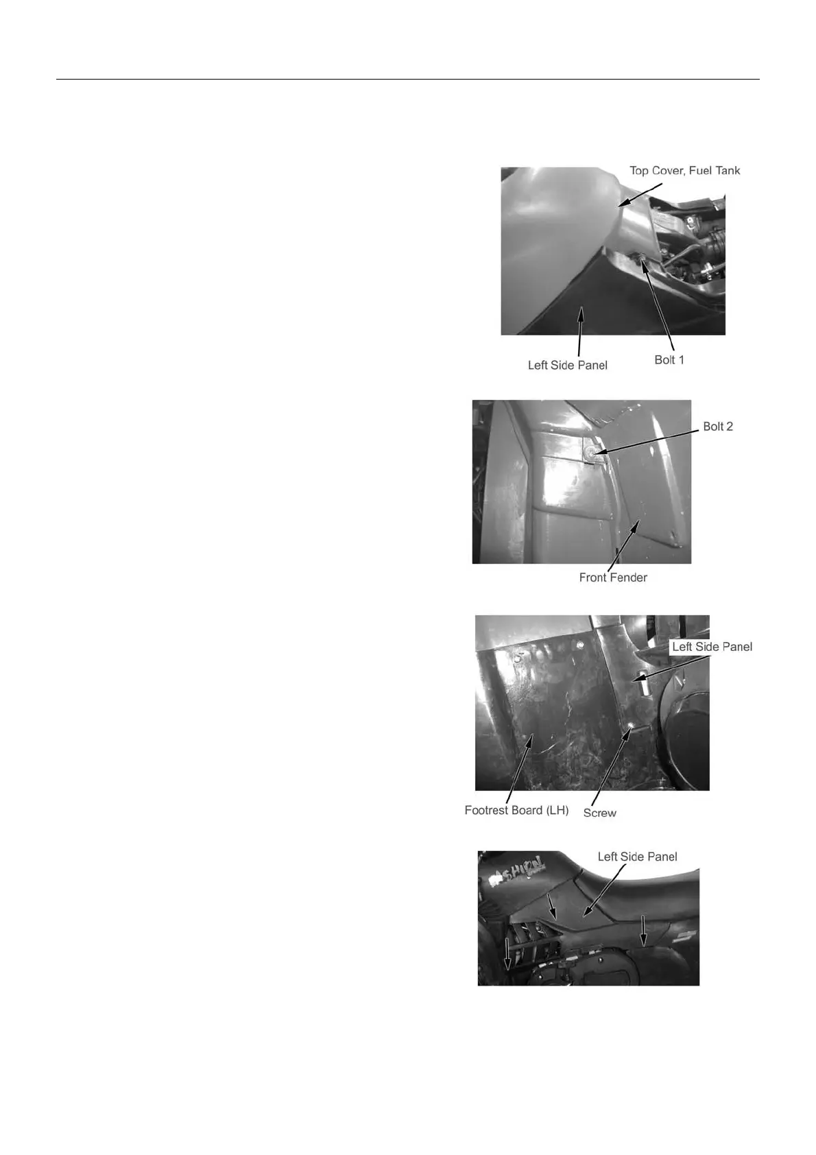 Remove Bolt 1 for left side panel and fuel tank top cover