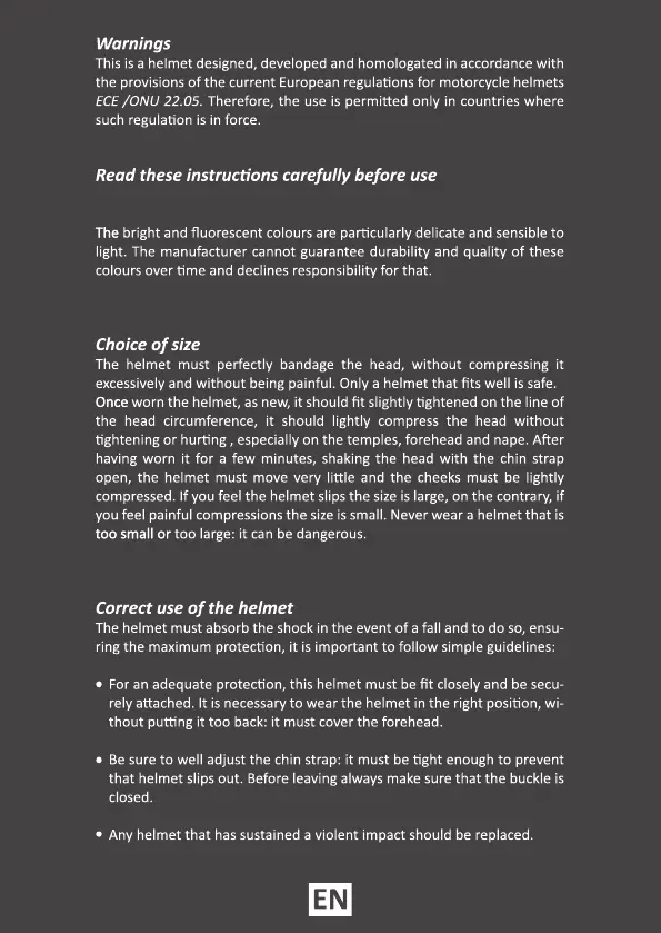 The helmet must absorb the shock in the event of a fall and to do so, ensu-