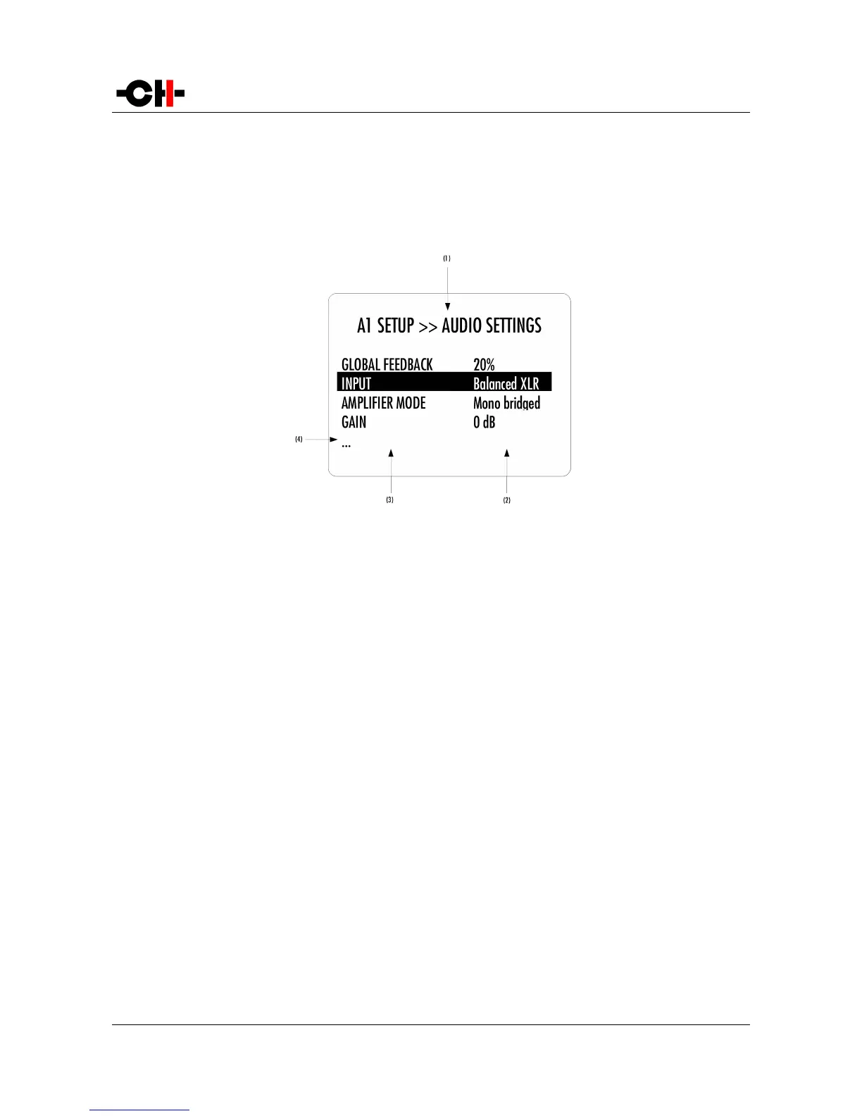 accessed. As an example, the following drawing shows the display elements of the A1 SETUP >> AUDIO SETTINGS sub-menu.