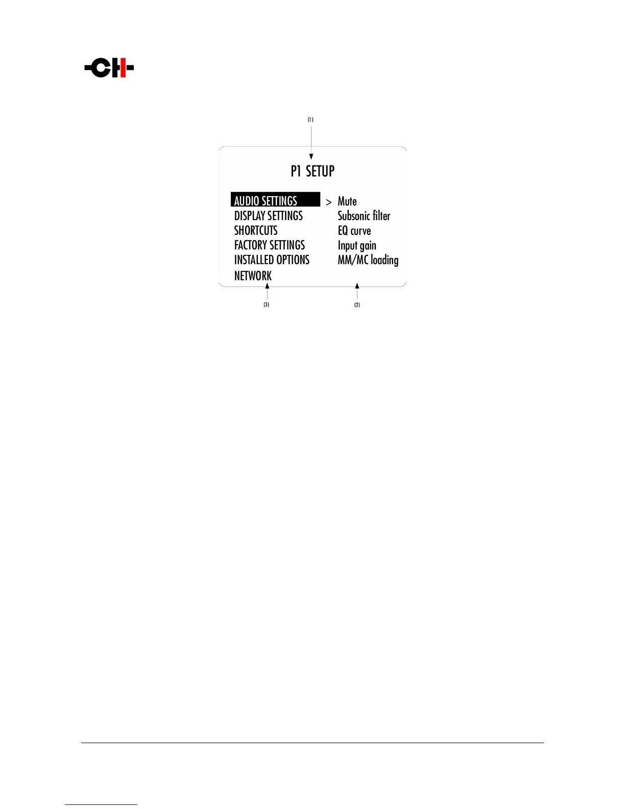 accessed. As an example, the following drawing shows the display elements of the P1 SETUP >> AUDIO SETTINGS sub-menu.
