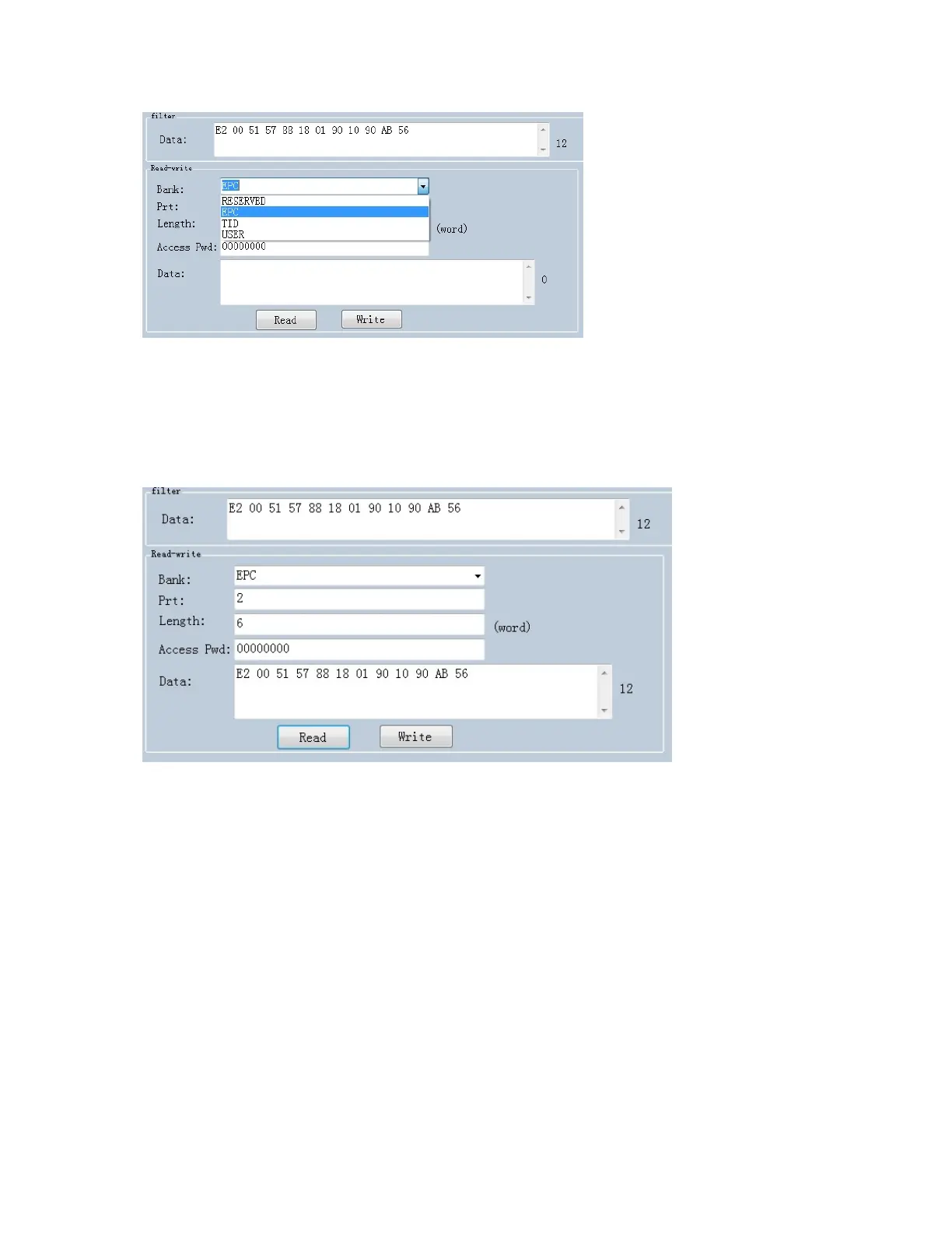 option is EPC reading, click “Read” to read 12 bytes of EPC area.