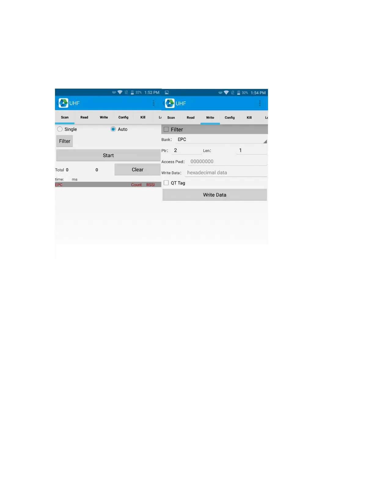 Click App Center, open UHF to scan, read and write tag information,