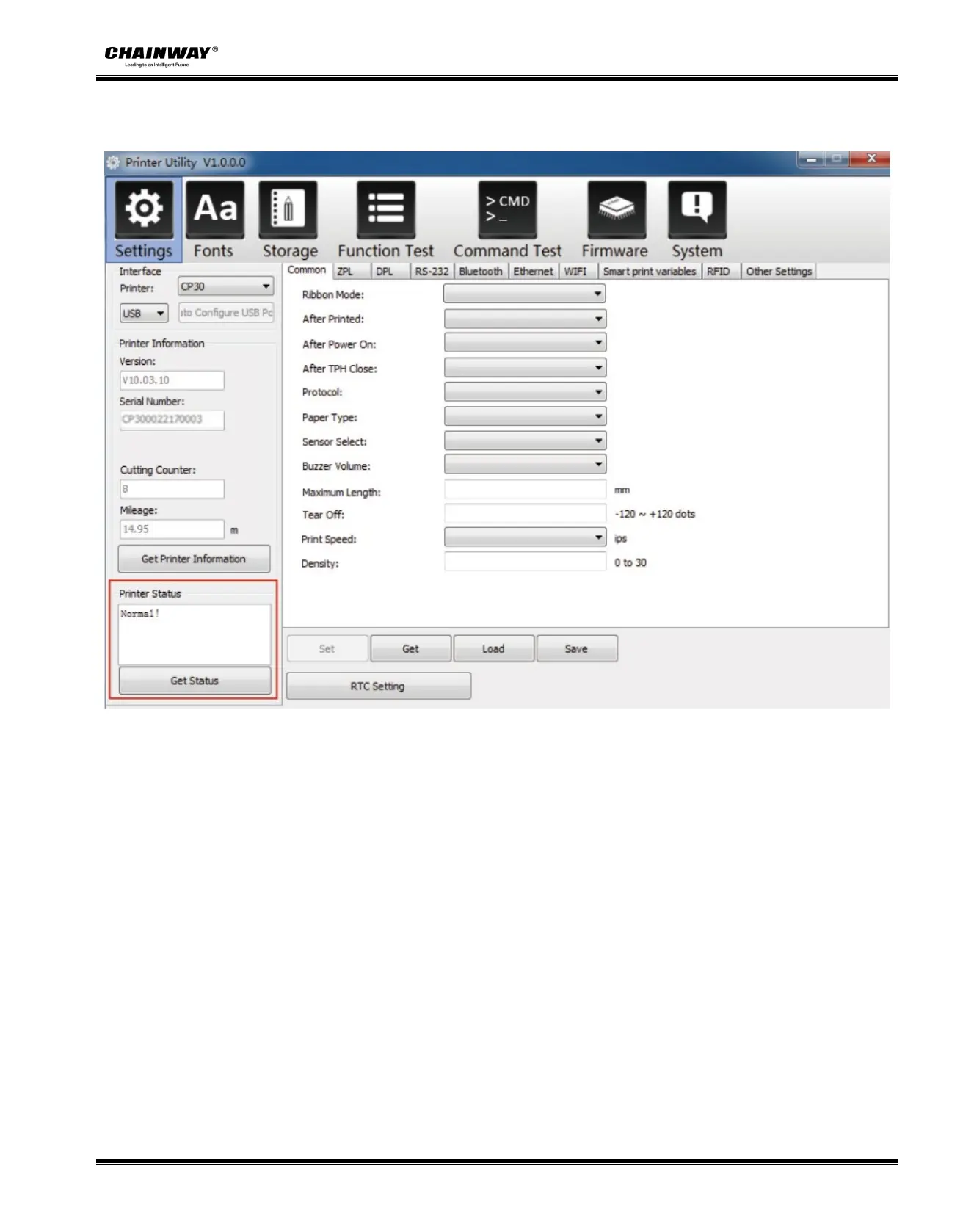 (3) Click “Get Status”, and printer status will show in the above.