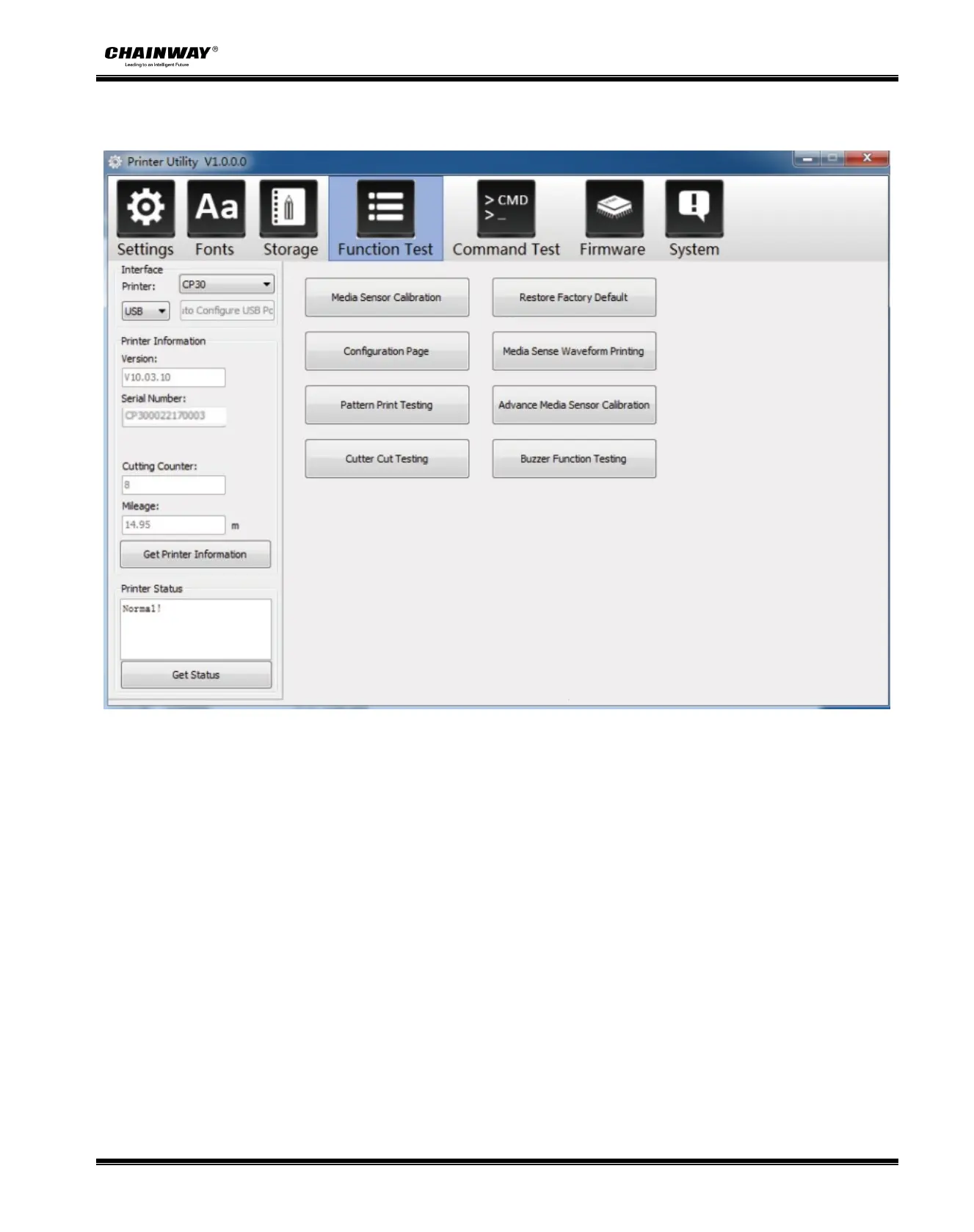 5.Click “Function Test”. User can carry the followings such as sensor calibration, pattern print testing and so on.