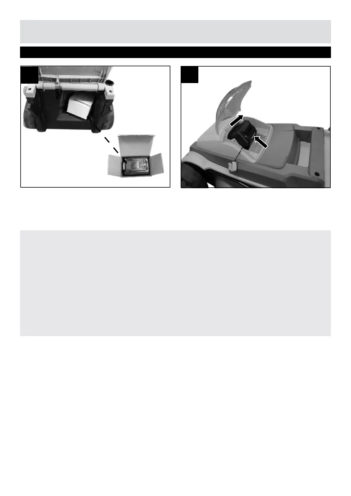 NOTE! The battery is stored under the safety flap during delivery. Take out the battery before fitting it