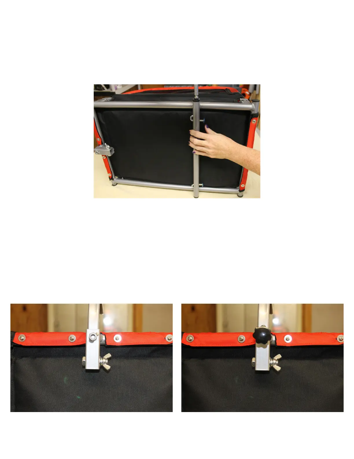 until the holes line up and re-install the bolt/wing nut. Insert and tighten the tension knob (right