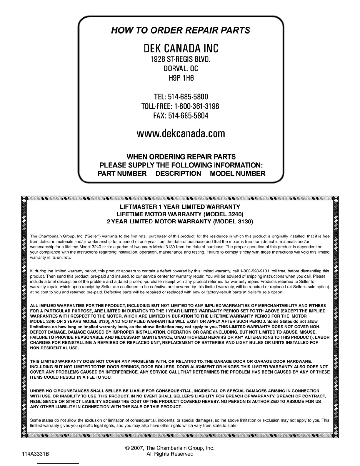 Chamberlain 3130 - Repair Parts and Service; Warranty