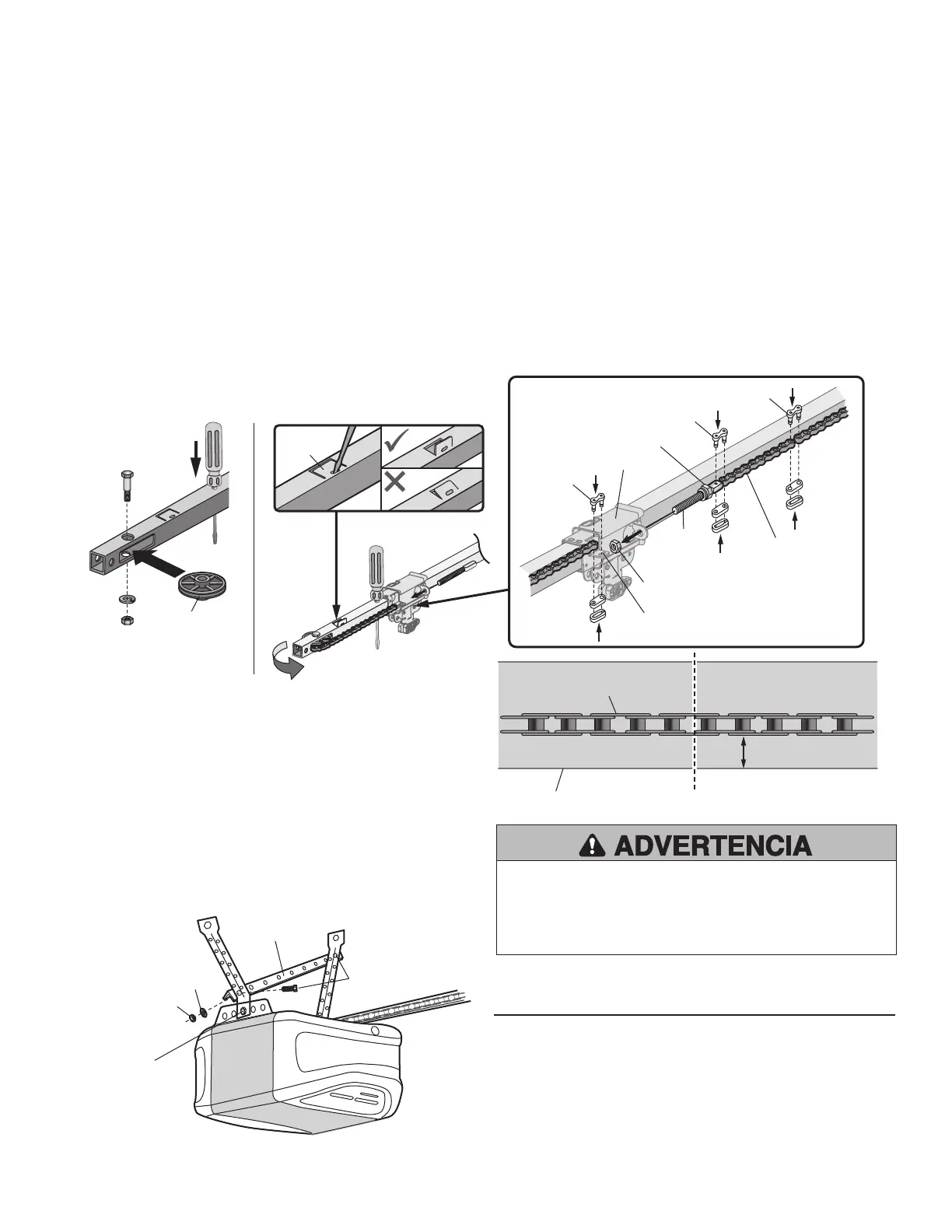 13. Con el carro contra el destornillador, jale la cadena a lo largo del riel