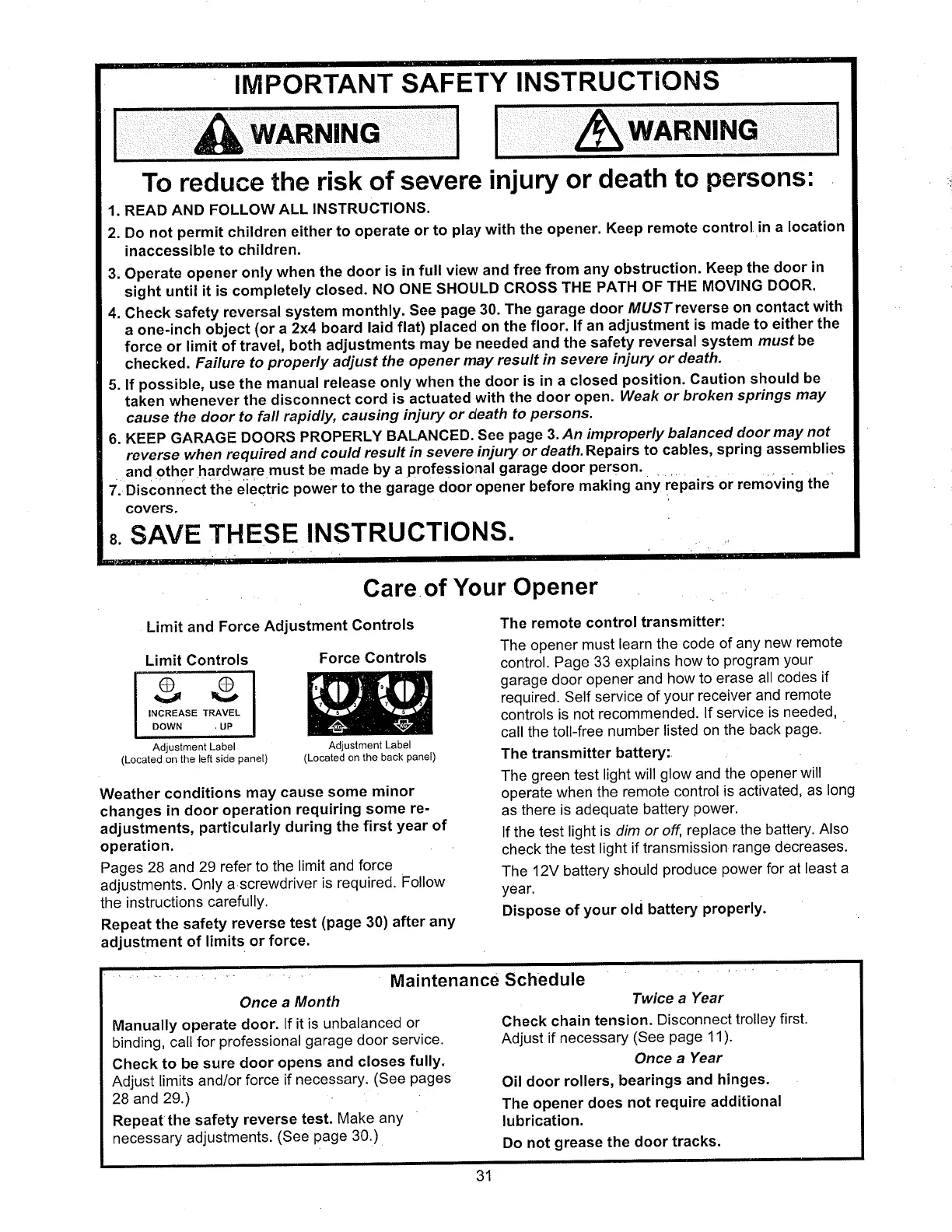 Chamberlain 710 WHC - Important Safety Instructions; Care of Your Opener