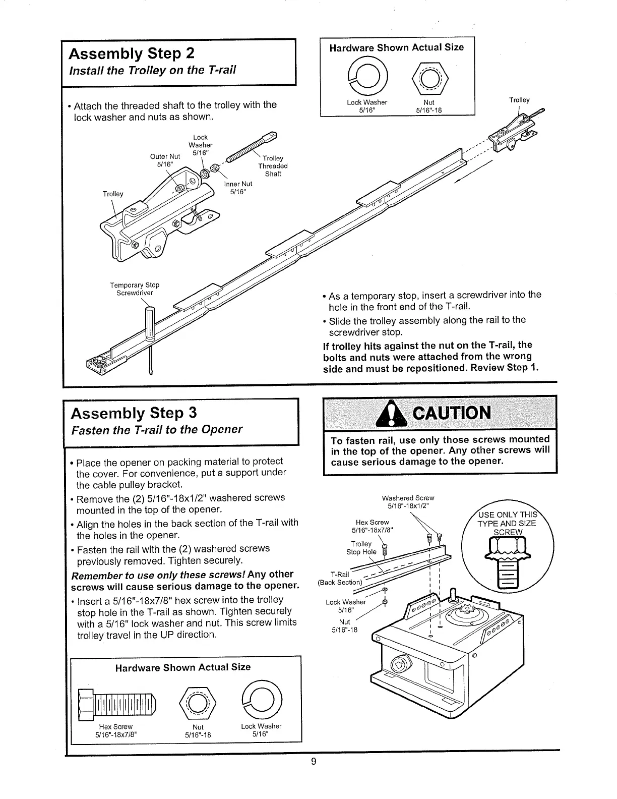 Chamberlain 710 WHC - Install the Trolley on the T-Rail; Fasten the T-Rail to the Opener