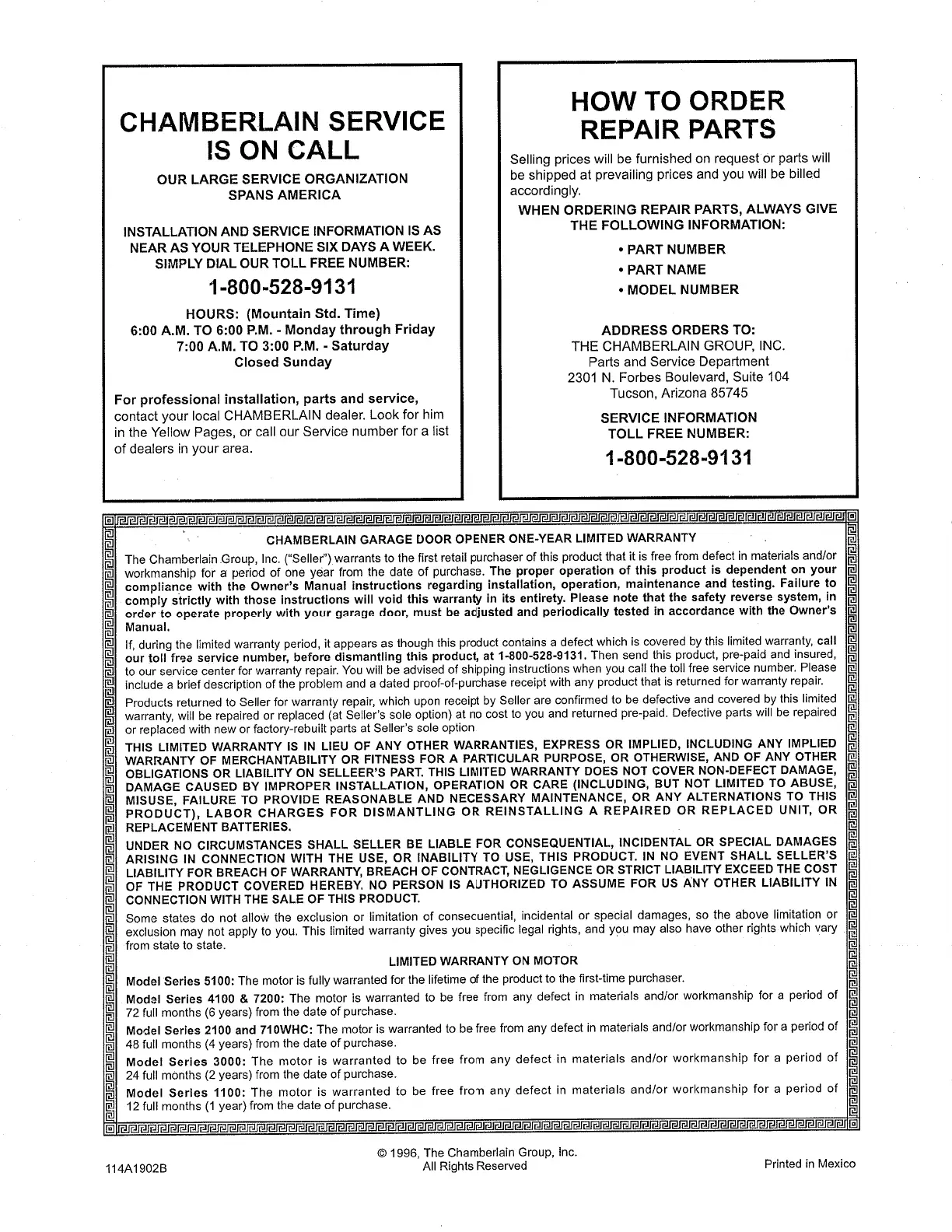 Chamberlain 7200 - ONE-YEAR LIMITED WARRANTY; Motor Warranty Details