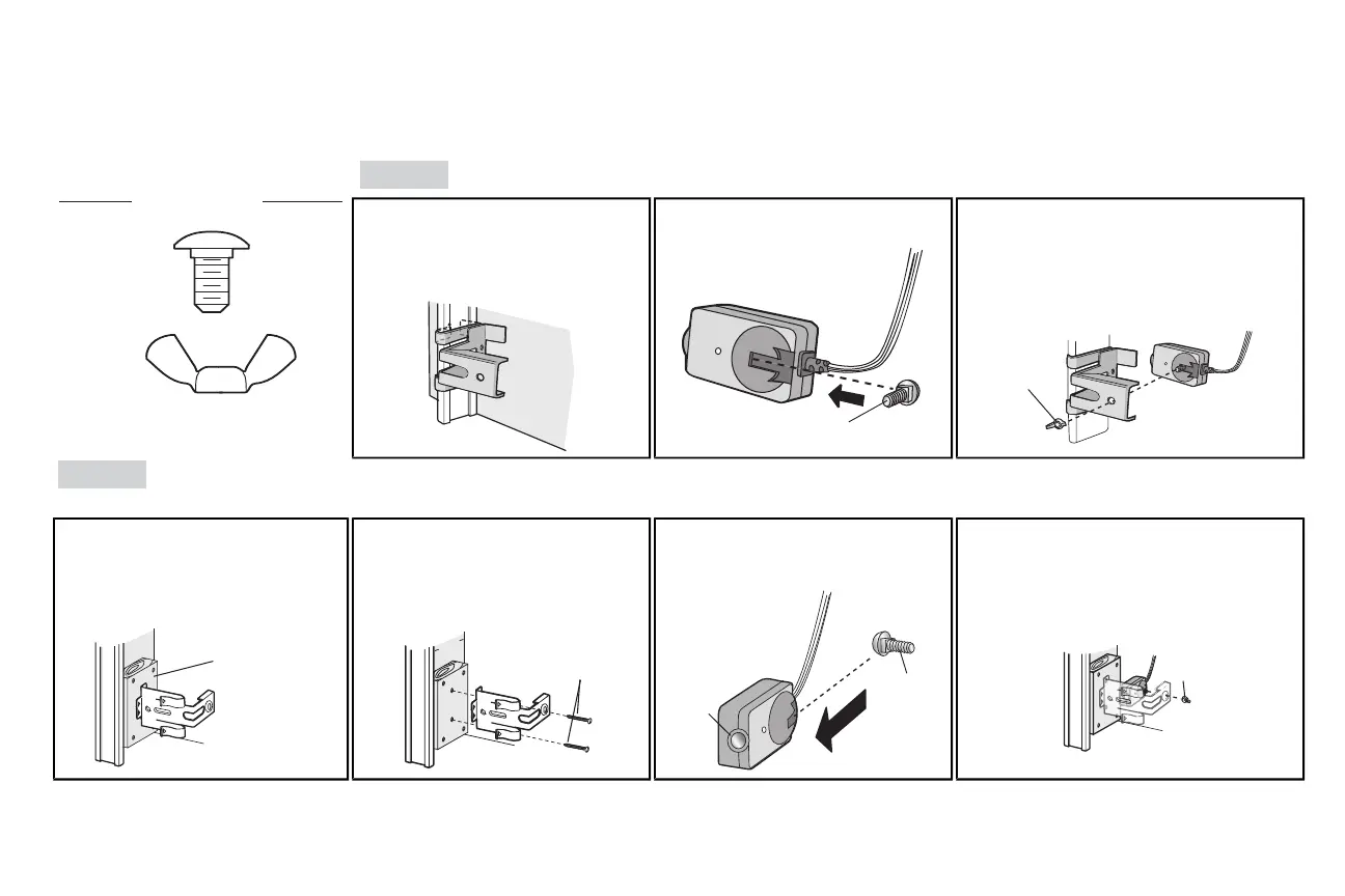 The safety reversing sensors can be attached to the door track, the wall, or the floor. Ifthe door trackwill not support the sensor bracket a wall installation isrecommended.Choose one of the following installations.