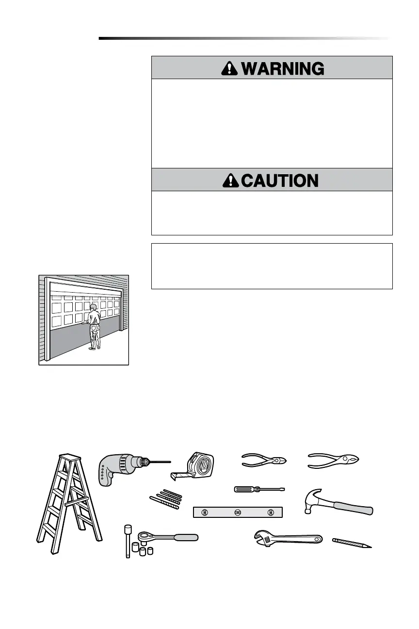 • NEVER try to loosen, move or adjust garage door, door springs, cables, pulleys,