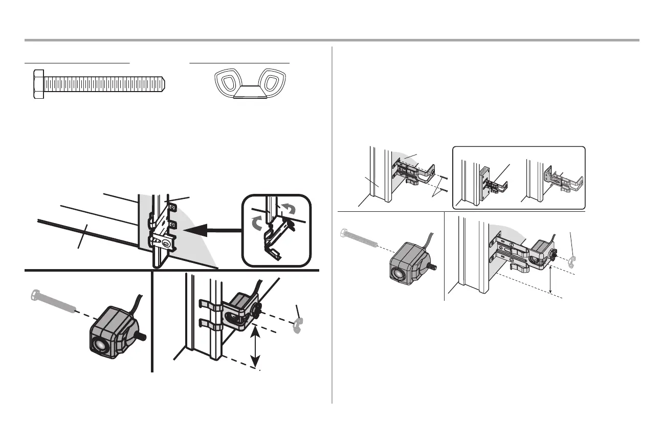 1. Slide the curved arms of the sensor bracket around the edge of the door track. Snap into place so that the