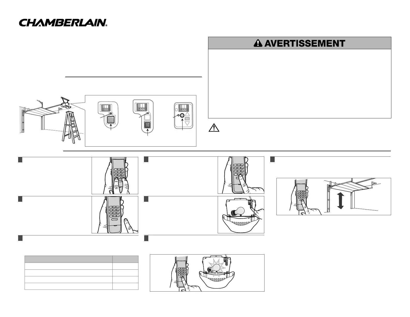 Pour des instructions de programmation supplémentaires ou une aide additionnelle, http://www.chamberlain.com/CatalogResourcesV3/en-us/shared/files/tucmanuals/114A5071.pdf