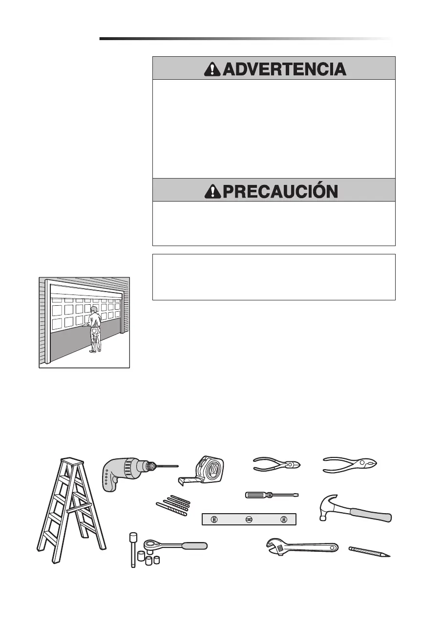 • NUNCA intente aflojar, mover o ajustar la puerta de garaje, resortes de puerta,
