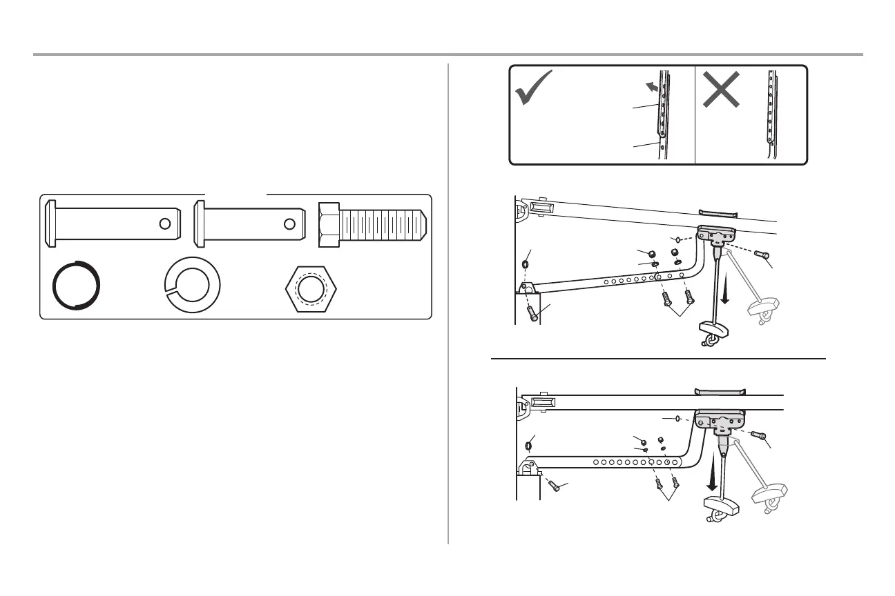 4. Attach the curved door arm to the trolley using the clevis pin. Secure with the ring fastener.