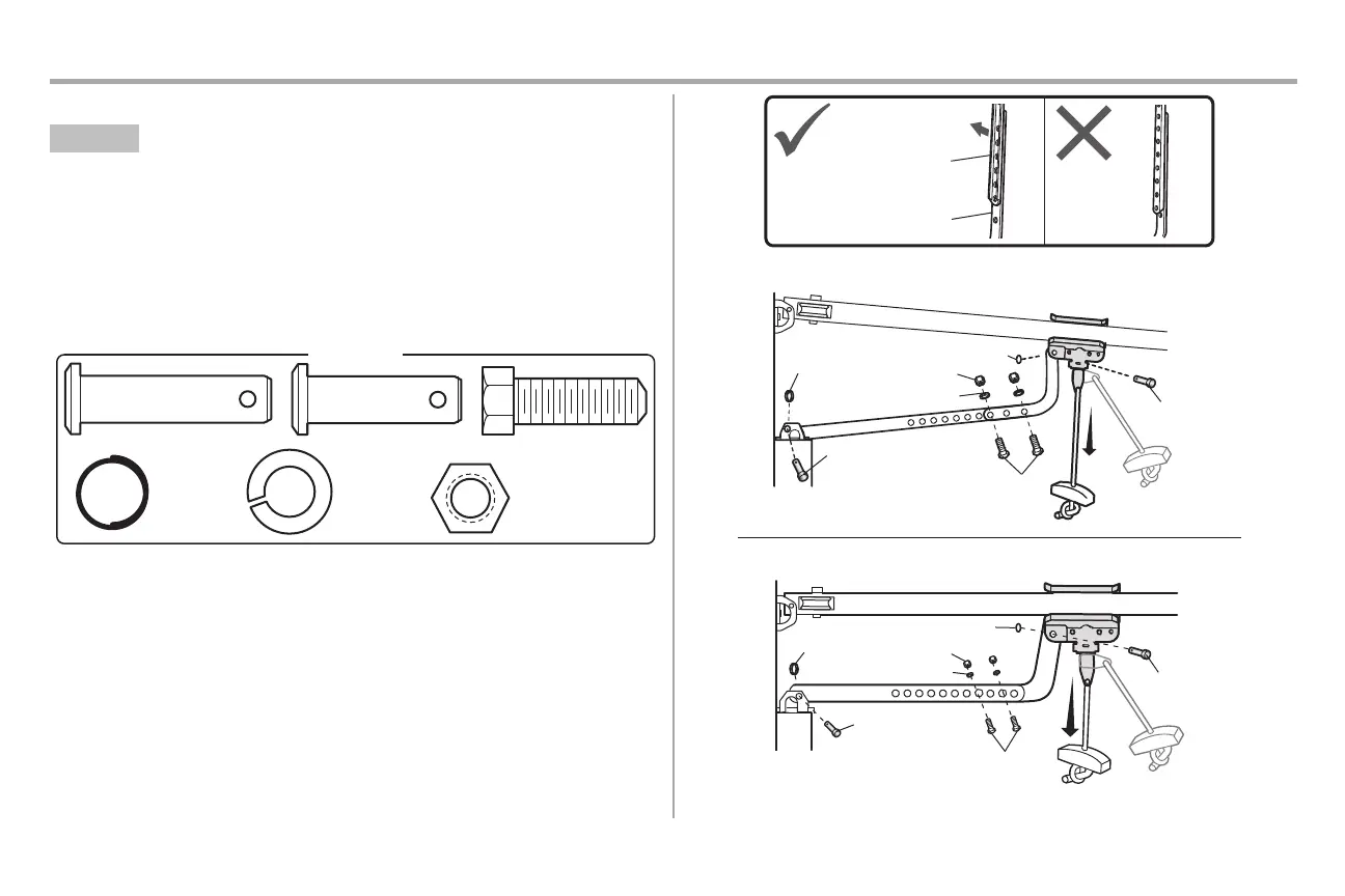 4. Attach the curved door arm to the trolley using the clevis pin. Secure with the ring fastener.