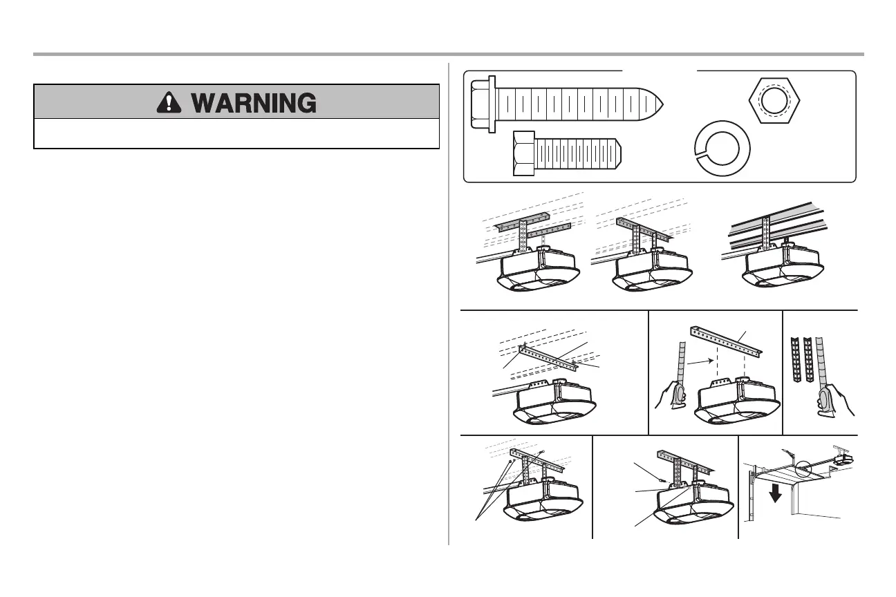 To avoid possible SERIOUS INJURY from a falling garage door opener, fasten it SECURELY to structural