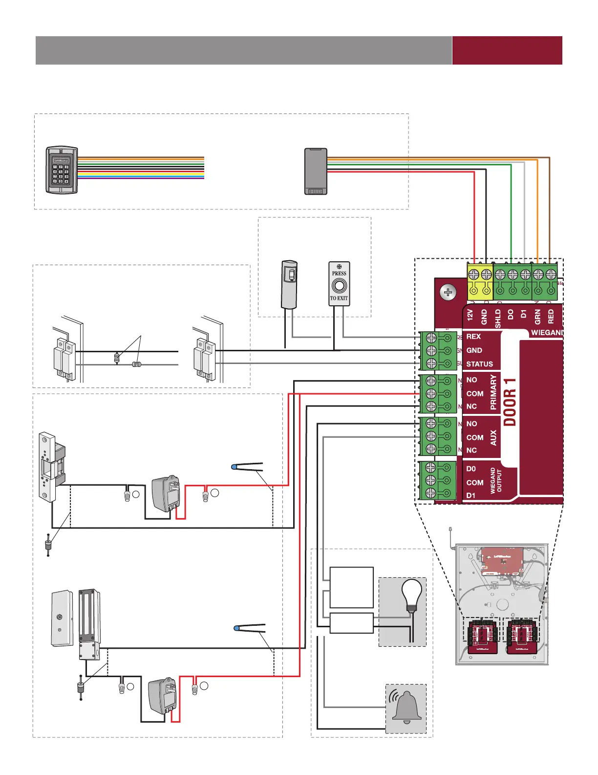 Disconnect power BEFORE making electrical connections. Below is an example of a wiring setup for door access. Door access can be
