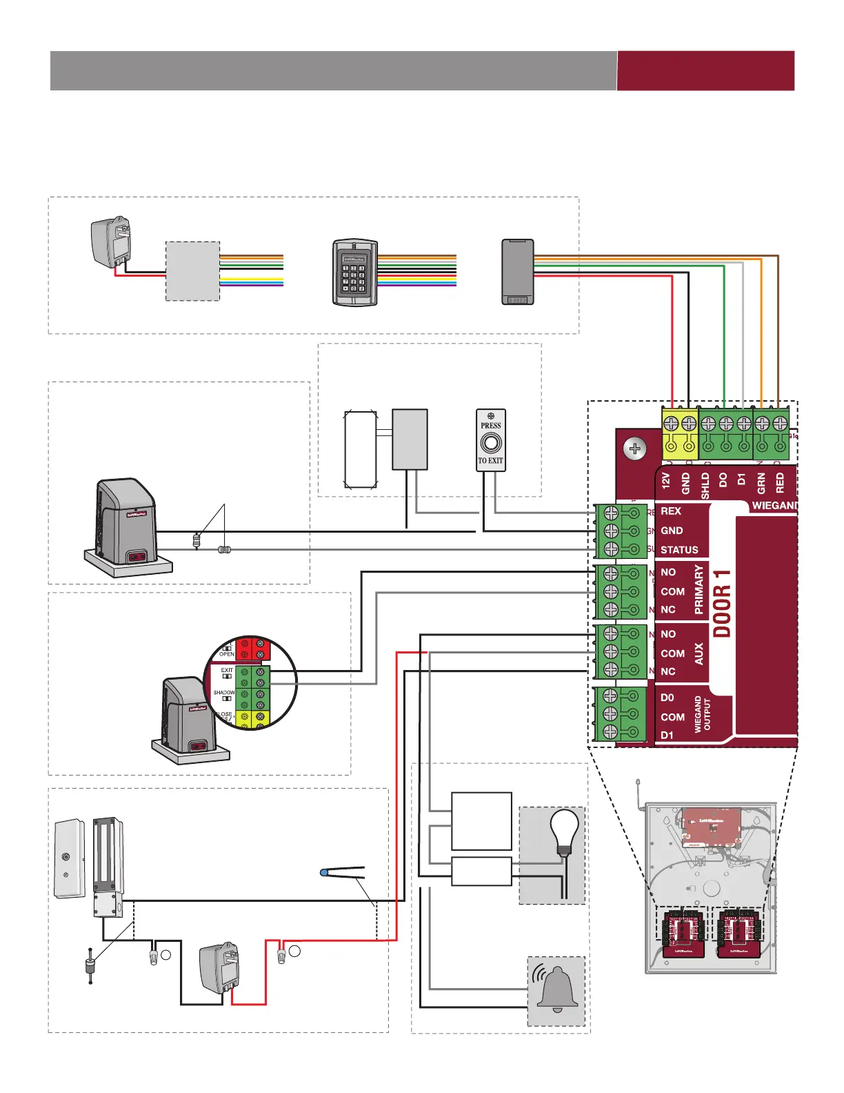 pour l’accès à la barrière. L’accès à la barrière peut être câblé à la porte1, 2, 3 ou 4 sur les cartes de porte. LiftMaster