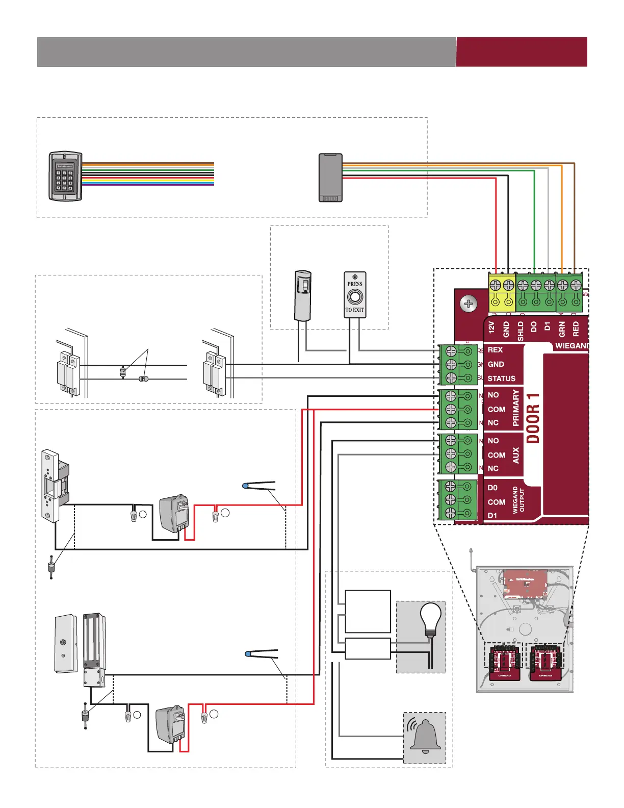 dessous pour l’accès à la porte. L’accès à la porte peut être câblé à la porte1, 2, 3 ou 4 sur les cartes de porte.